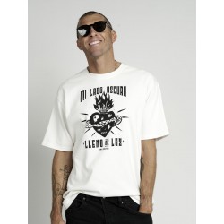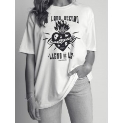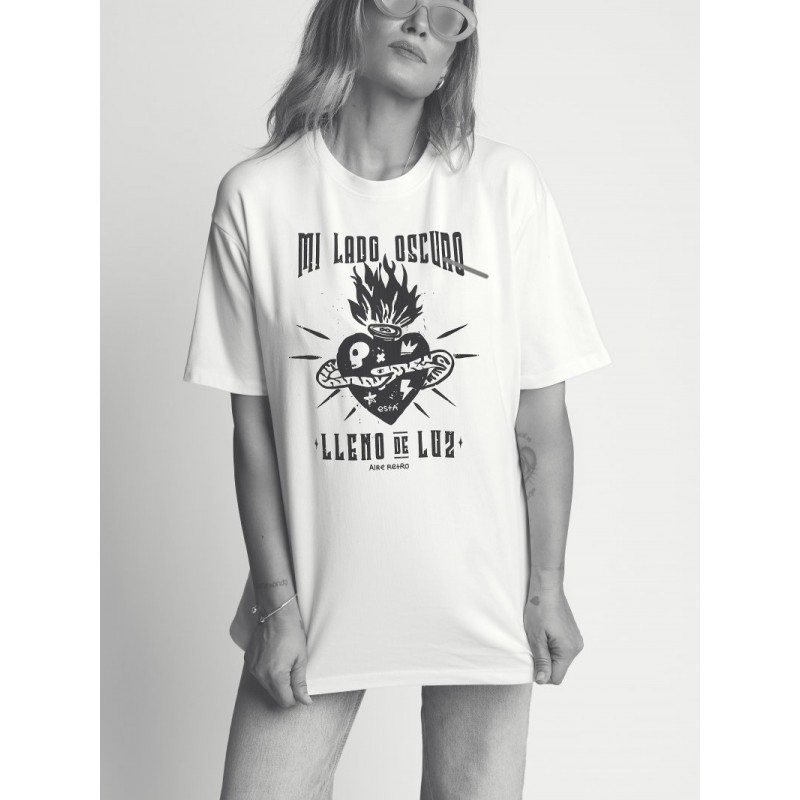 Camiseta Unisex Mi lado oscuro Blanca de Aire Retro. Camiseta recta, de corte unisex, de color blanco e ilustracion Mi lado oscuro (corazon en llamas con la frase Mi lado oscuro esta lleno de luz) en color negro.