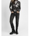 Camiseta Tul Lady Violet de Aire Retro. Camiseta de manga larga efecto segunda piel de tul en color negro, con ilustracion de una calavera con flores violetas en la cabeza.