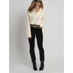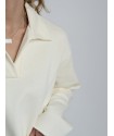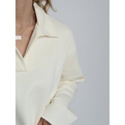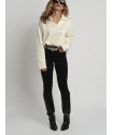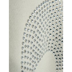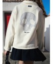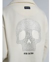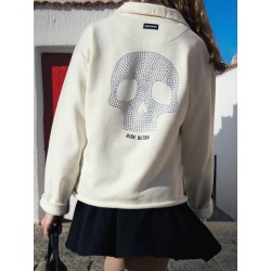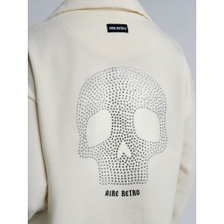 Sudadera Calavera Cristal de Aire Retro. Sudadera de manga larga, corte tipo polo, con cuellos y escote en pico. Color crudo y una espalda espectacular, con el dibujo de una calavera realizada con cristalistos tipo strass plateados.