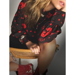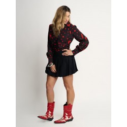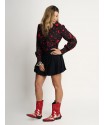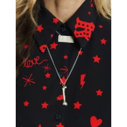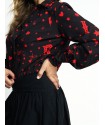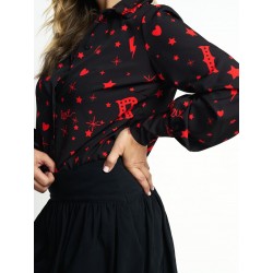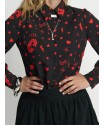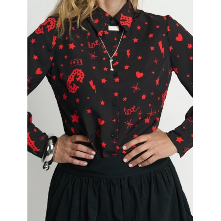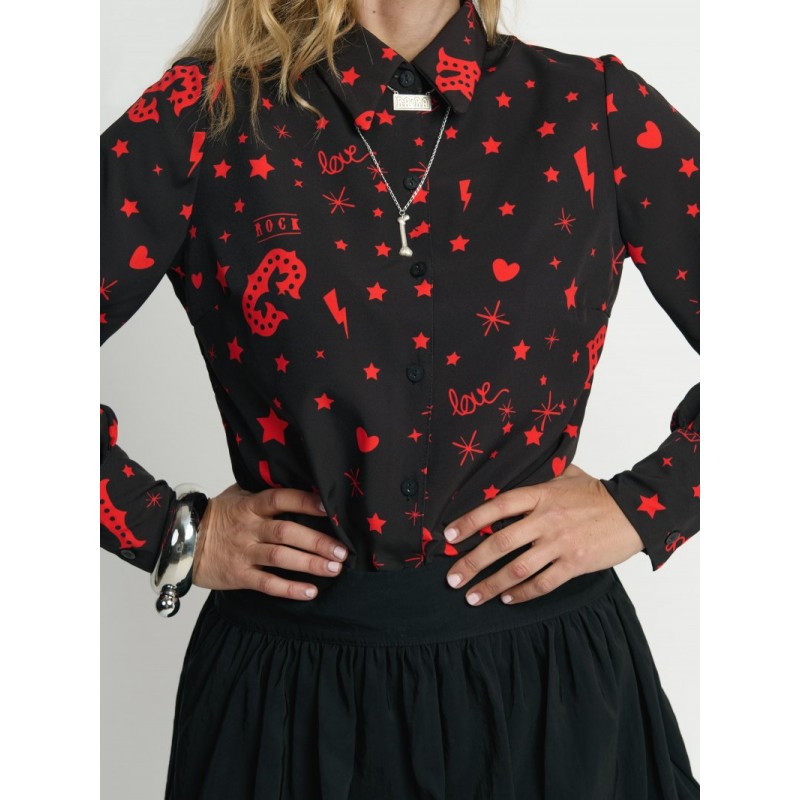 Camisa Circo - Rock Negra de Aire Retro. Camisa de manga larga con base en color negro y estampado en color rojo de pequeñas estrellas, rayos, corazones, palabras Rock... que le aportan un toque divertido. Cuello camisero y mangas ligeramente abullonadas.