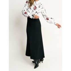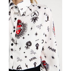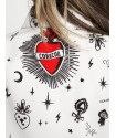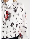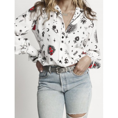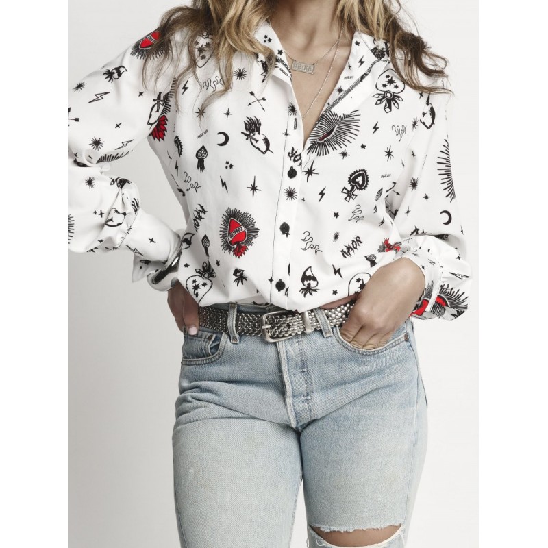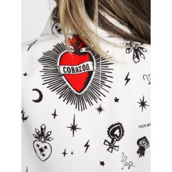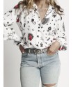 Camisa Corazones Blanca de Aire Retro. Camisa de manga larga con base en color blanco y estampado de corazones (ya usado en varias prendas) en tonos rojos y negros. Cuello camisero y botones en negro mate a contraste.