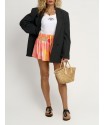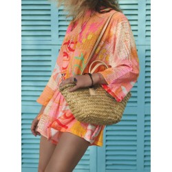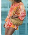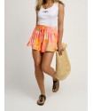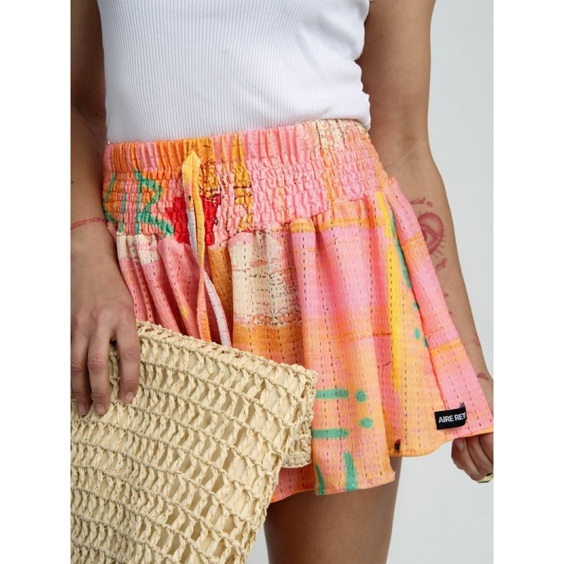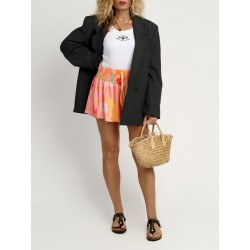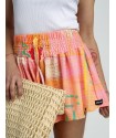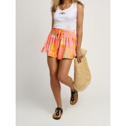 Short Posible de Aire Retro. Pantalon corto, tipo short, que hace efecto de falda pantalon gracias a su fluidez. Tejido de punto, con calados, finito y fresco, ideal para la primavera verano. Base en color naranja claro, con un estampado que es diferente entre prendas, ya que es tan grande que no todas las prendas coinciden en el mismo sitio por lo que todavia la hace mas especial.