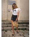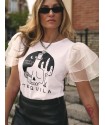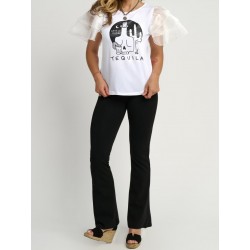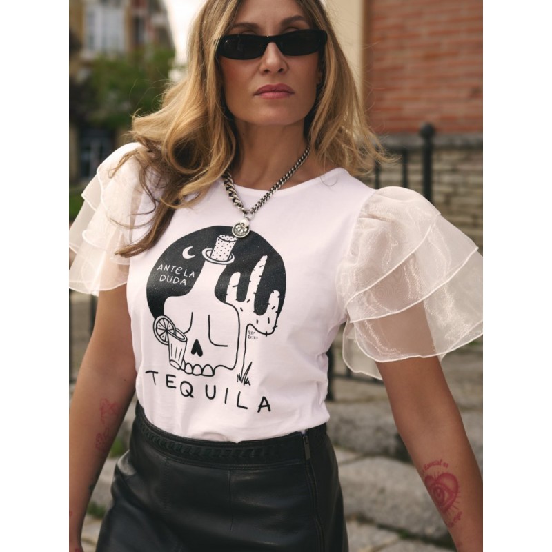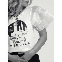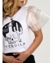 Cami Tequila Manga Organza de Aire Retro. Camiseta blanca, con ilustracion frontal de Tequila en color negro a contraste. Cuello redondo y mangas realizadas en tejido de organza de color blanco, que aporta un toque especial a la camiseta.