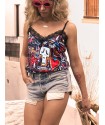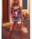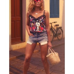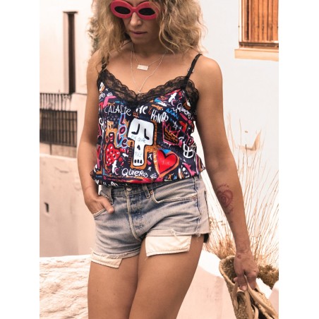 Lencera Love Pop de la marca Aire Retro. Camiseta de tirantes tipo lencera, con total print Love Pop, ya utilizada en otras prendas en temporadas anteriores. Tirantes finos regulables y encaje en escote y espalda.