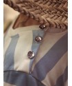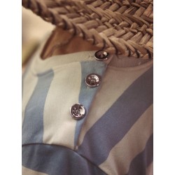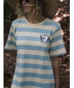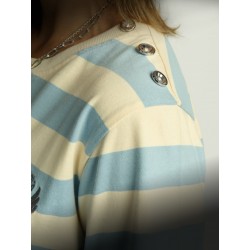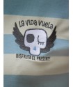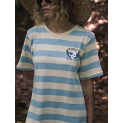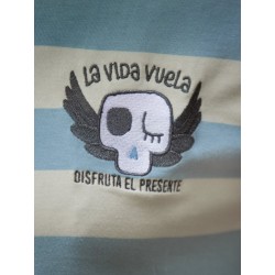 Vestido Rayas La Vida Vuela Azul de Aire Retro. Vestido a rayas azules y crudas, recto de corte midi y manga corta. Detalle de botones decorativos en el hombro así como abertura lateral en el bajo para mayor comodidad.  Bordado con hilo lurex en pecho de calavera alada junto a la frase "la vida vuela, disfruta el presente".