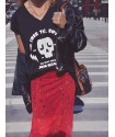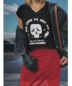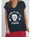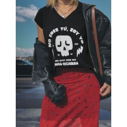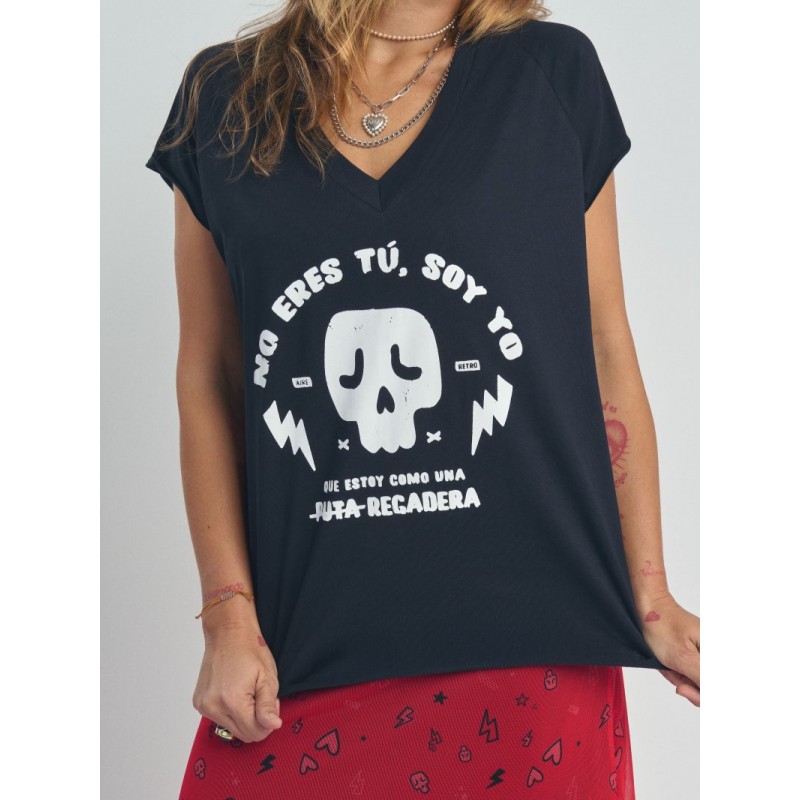 Camiseta Regadera Negra de Aire Retro. Camiseta de algodon, con cuello pico y de manga corta en color negro. Maxi print frontal en color blanco con una calavera y la siguiente frase "No eres tu, soy yo que estoy como una puta regadera"