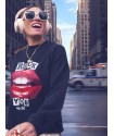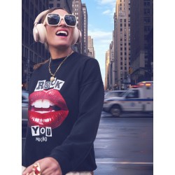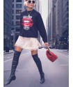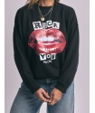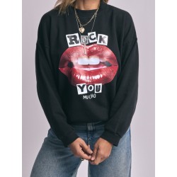 Sudadera Labios Rock You de Aire Retro. Sudadera de color negro con corte oversize y una ilustración delantera a todo color de unos labios y la frase "ROCK YOU MUCHO"
