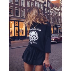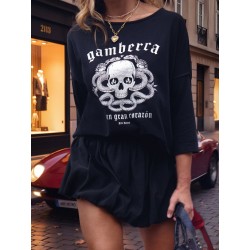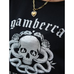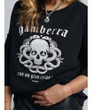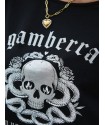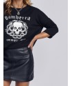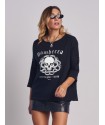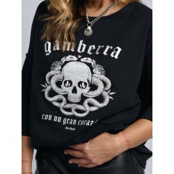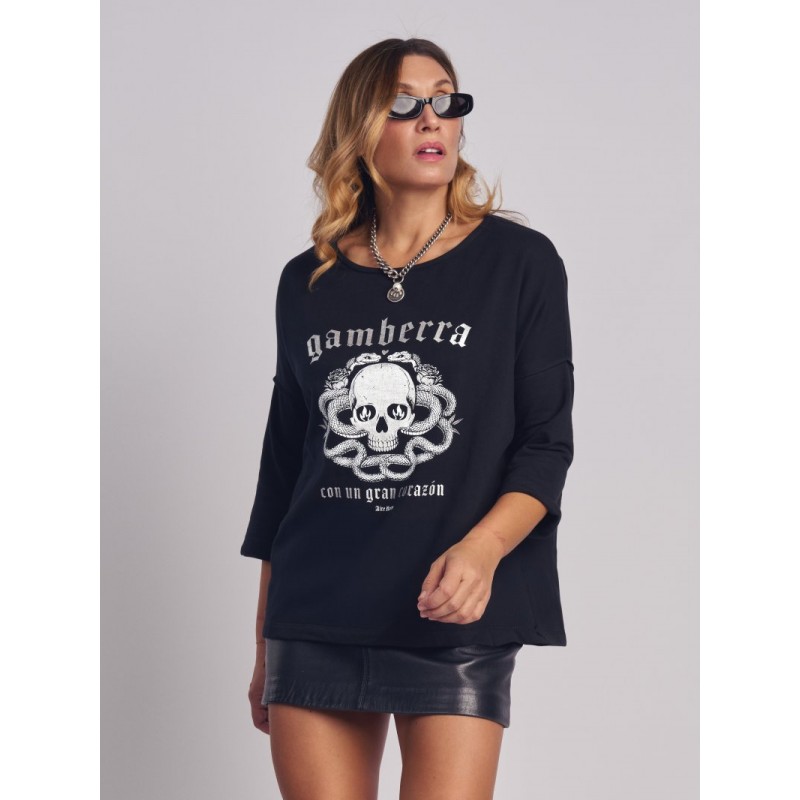 Jersey amberra Negro de Aire Retro. Jersey negro de manga 3/4 y cuello abierto, con felpa fina en su interior, ideal para la temporada de otoño, muy gustosa y agradable. Serigrafía frontal de una calavera entre dos serpientes realizada en blanco y plata que queda genial.