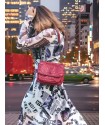 Falda Tul Sara Roja de Aire Retro. Falda larga de tul rojo con forro interior hasta la rodilla y estampado con pequeños motivos de calaveras, corazones, estrellas y rayos.