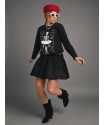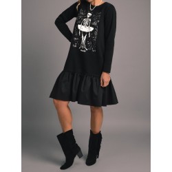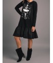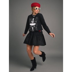 Vestido Negro Ballet de Aire Retro. Vestido corto de algodon, con tejido combinado en negro en la parte superior con ilustracion del esqueleto haciendo ballet con efecto relieve y en color blanco a contraste.