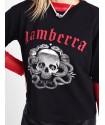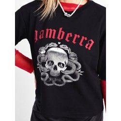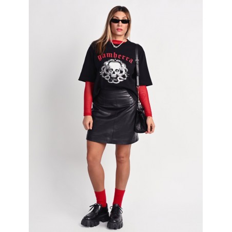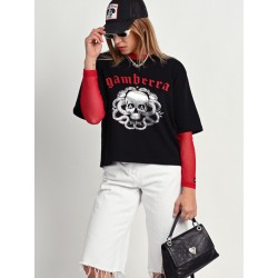 Camiseta Gamberra de Aire Retro. Camiseta de manga corta, realizada en color negro con ilustración delantera "gamberra" en rojo y en foil que le aporta un toque de brillo. De corte más corto en cintura y largo en mangas.
