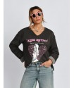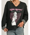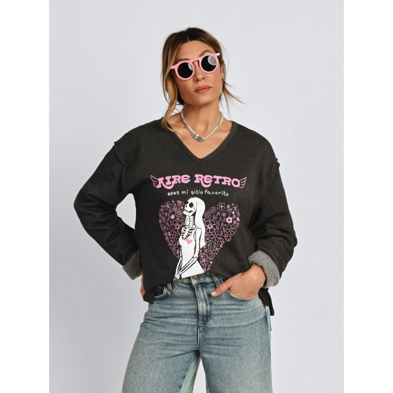 Sudadera Gris Mi Sitio Favorito de Aire Retro. Sudadera de algodon premium con una felpa interior muy gustosa, de corte elegante con su cuello pico y manga caída. Ilustracion frontal en rosa y blanco mezclando romanticismo y rock que caracteriza a la marca en cada diseño.