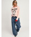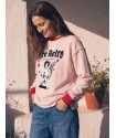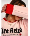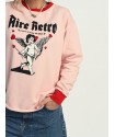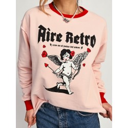 Sudadera Rosa Cupida de Aire Retro. Sudadera de algodon gordito, con una felpa interior muy gustosa y calentita,en color rosa bebé, con cuello y puños en rojo. Ilustración frontal "cupida" con detalle de rosas y corazones también en rojo.