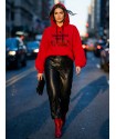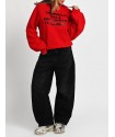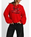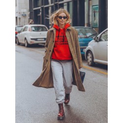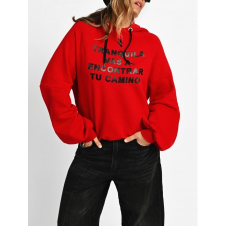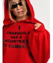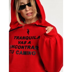 Sudadera Hoodie Tranquila Roja de Aire Retro. Sudadera de color rojo de algodón, con cuello redondo y capucha y manga larga ámplia finalizada en puño elástico. Frase frontal en serigrafía de caja engomado "tranquila vas a encontrar tu camino" en color negro con un rayo sobre ella y a conjunto con los cordones de la capucha.