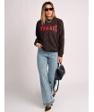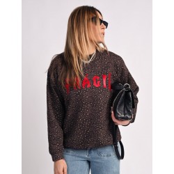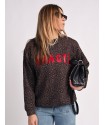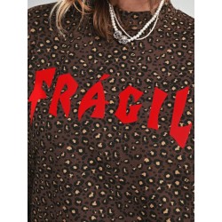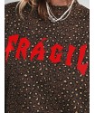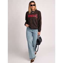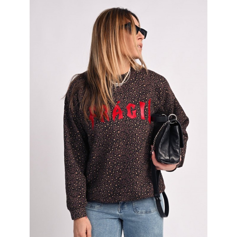 Sudadera Leopardo Fragil de Aire Retro. Sudadera de corte oversize, con un fondo en chocolate (color super en tendencia) con estampado de leopardo y la palabra Fragil en letras rojas a contraste en el frontal.