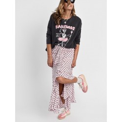 Jersey Bailemos de Aire Retro. Jersey tipo sudadera, fino, de algodon , con efecto fade out sobre una base gris y con un print frontal en tonos rosas y blancos que contrasta genial y que ha quedado espectacular.