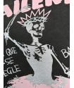 Vestido Rock & Chic Negro de Aire Retro. Vestido LBD (Little Black Dress), de punto roma, con cierre de botones plateados efecto tachuela que también presenta en los puños de las mangas. Estampado espectacular en la espalda "rock & chic" con letras efecto relieve en plata y una calavera con un lazo rojo a contraste. De corte evasé cómodo a la vez que elegante con su toque rock en la espalda.