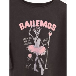 Un esqueleto con tutu de ballet en color rosa y la palabra Bailemos en tono rosa para darle un toque de color.