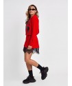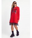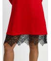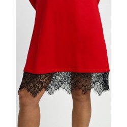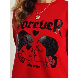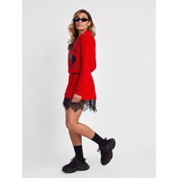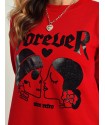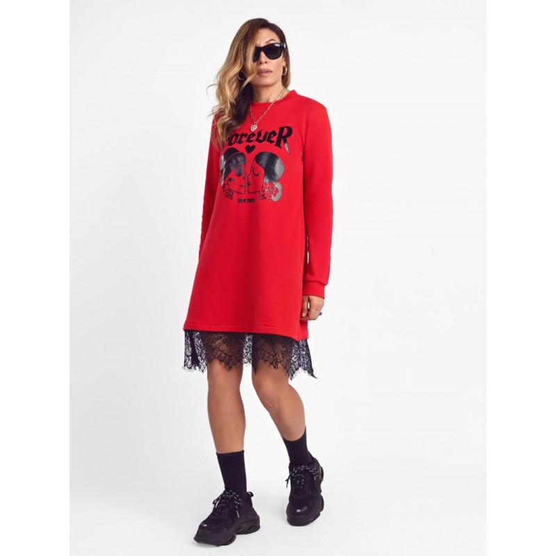 Vestido Rojo Forever Blonda de Aire Retro. Vestido corto de color rojo, con blonda super suave de encaje en la parte inferior. Tejido de algodon, con felpa calentita en el interior y print frontal de dos calaveras mirandose y la palabra Forever en relieve de color negro.