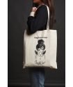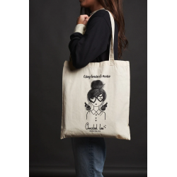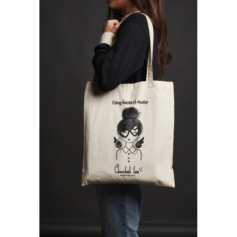 Tote Bag Moño de Anabel lee. Bolso Tote Bag de color crudo, tira larga y maxi print frontal de la ilustracion de Moño de la marca con su frase "Estoy hasta el moño".