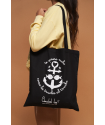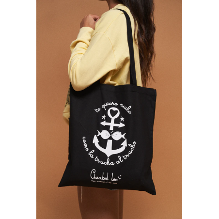 Tote Bag Ancla de Anabel lee. Bolso Tote Bag de color negro, tira larga y maxi print frontal de la ilustracion de Ancla de la marca, con su frase "te quiero mucho, como la trucha al trucho".