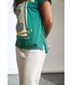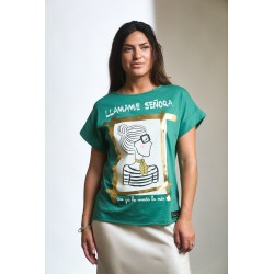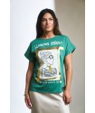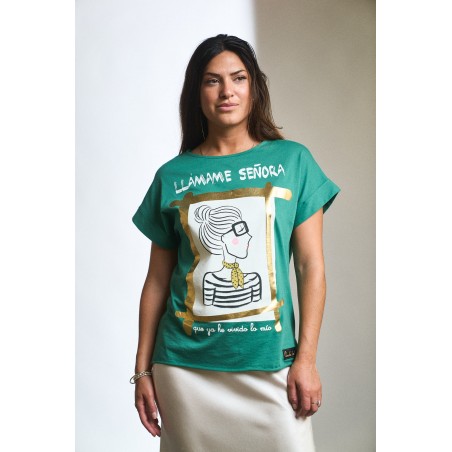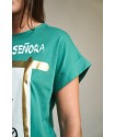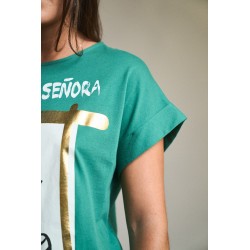 Camiseta Señora de Anabel Lee. Camiseta de manga corta, en un color verde esmeralda que ha quedado espectacular con un maxi print en tonos blancos, negros y dorados que resaltan mucho sobre el fondo.