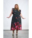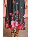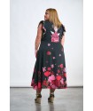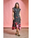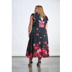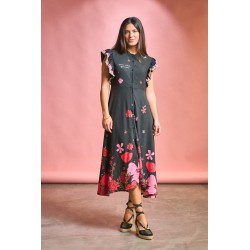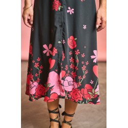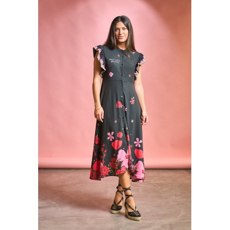 Vestido Paula de Anabel Lee. Vestido midi, con base en color negro e ilustraciones por todo el vestido. Corte camisero e imperio, con la frase en la parte frontal "Estado actual: floreciendo" y con la parte frontal del vestido llena de flores rosas y rojas en la parte inferior.