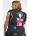 En la espalda. maxi print de una chica en la parte superior y zona de falda con las mismas flores que el delantero.