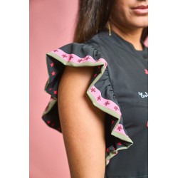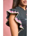 Volantes en la zona de hombros, finalizados en tiras verdes y rosas como las que llevaba el Pantalon Cosmos.