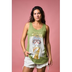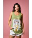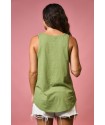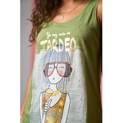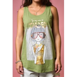 Camiseta TARDEO de Anabel Lee. Camiseta de tirante ancho, entallada en pecho y corte evase. Con el mismo corte que las camisetas Verbena y Lollypop, en un algodón de color verde kaki super favorecedor.