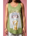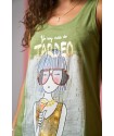 Maxi print frontal de una chica con una copa y una camiseta de tirantes con toques de brilli (son serigrafias con toques fotográficos), y con una frase para una actitud que esta de moda "Yo soy mas de tardeo" en foil dorado.