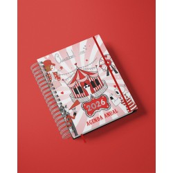 Agenda 2026 de la marca Anabel lee con ilustraciones de tematica CIRCO, tan utilizado por la marca y que la representa totalmente. Payasos, domadoras, trapecistas, forzudos, equilibristas y elementos tipicos del circo.