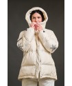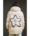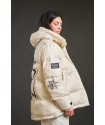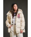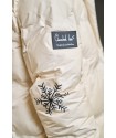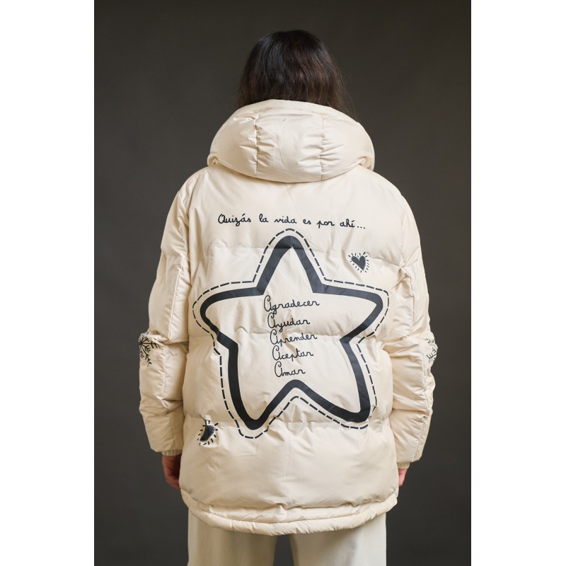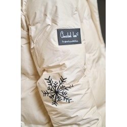 Plumifero Helsinki de Anabel Lee. Plumifero corto, hasta medio culete con base en color crudo y llena de detalles. De corte evase y con los largos desiguales (el bajo trasero es redondeado) es perfecto para aquellas que tengan la cadera algo mas amplia, dando mayor comodidad a la prenda.
