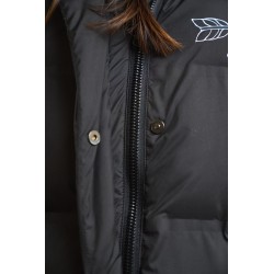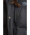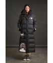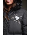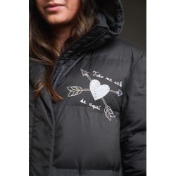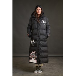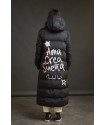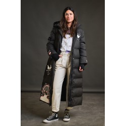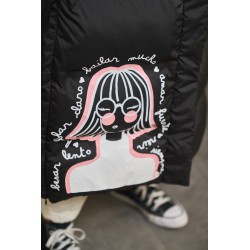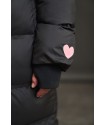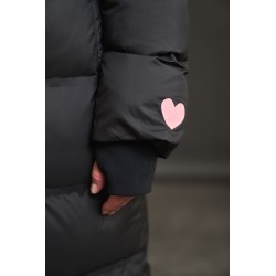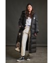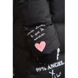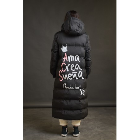 Plumifero Oslo de Anabel Lee. Plumifero midi, tirando a largo lleno de detalles en blanco y rosa. Plumifero de corte recto con base en color negro y largo maxi.