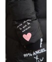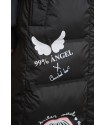Ilustracion frontal en el pecho con un corazon blanco atravesado por flechas con la frase "Todo me sale de aqui". El el otro lateral frontal, a media altura unas alitas blancas y 99% Angel en color blanco serigrafiado.