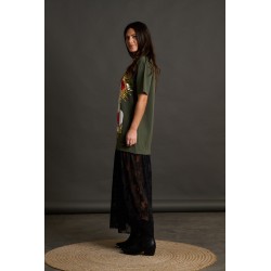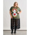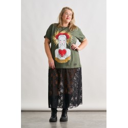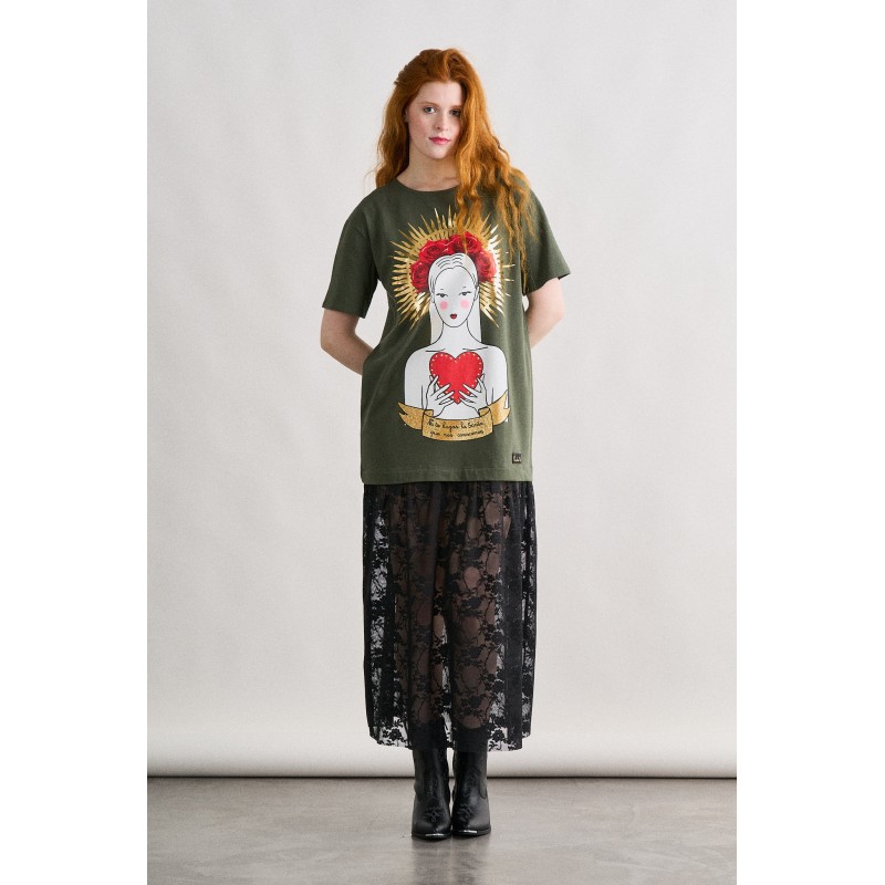 Ilustracion frontal en el pecho con un corazon blanco atravesado por flechas con la frase "Todo me sale de aqui". El el otro lateral frontal, a media altura unas alitas blancas y 99% Angel en color blanco serigrafiado.