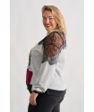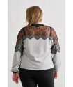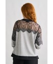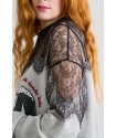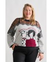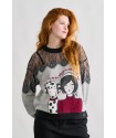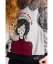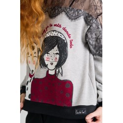 Sudadera Dalmatas de Anabel Lee. Sudadera de manga larga, en color gris claro con ilustracion de una chica con un dalmata y con detalles en terciopelo de color granate (en la camiseta de la chica) y con la parte superior de la sudadera con encaje negro que abarca hombros y el inicio de las mangas.