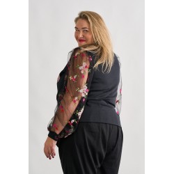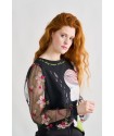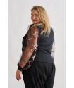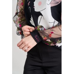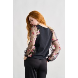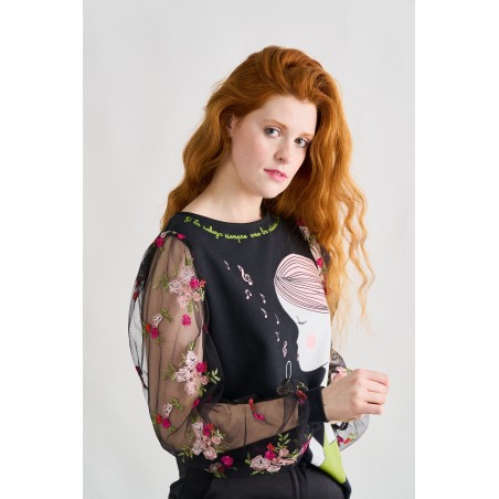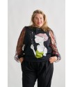 Sudadera Dalmatas de Anabel Lee. Sudadera de manga larga, en color gris claro con ilustracion de una chica con un dalmata y con detalles en terciopelo de color granate (en la camiseta de la chica) y con la parte superior de la sudadera con encaje negro que abarca hombros y el inicio de las mangas.