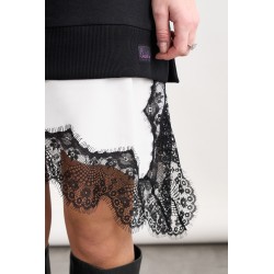 En la parte delanera en el pecho, bordado con unas alas y un corazon con lentejuelas.