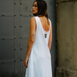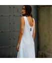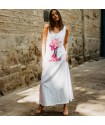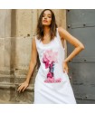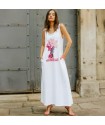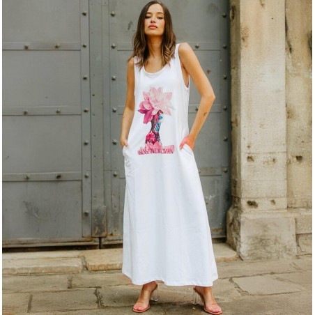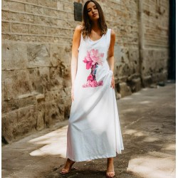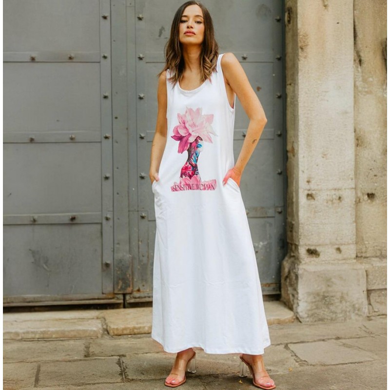 Vestido Sensitive Woman de la marca Be Happiness. Vestido largo de algodon, de tirante ancho y base en color blanco. Maxi print frontal de la nueva ilustracion Sensitive Woman , en tonos azules y rosas.
