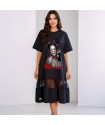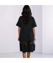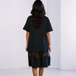 Vestido Brave Spirit de la marca Be Happiness. Vestido en color negro con un fit oversize y combinado con elegante tul negro en la parte baja que le aporta un toque único y le aporta un efecto visual atractivo al caminar. Prenda de tejido cómodo y suave con manga corta y cuello redondo. Ilustración delantera en el que combina el tono rojo a contraste y que completa el diseño dándole el toque al que nos acostumbra la marca y que tanto gusta. Dispone de bolsillos laterales.