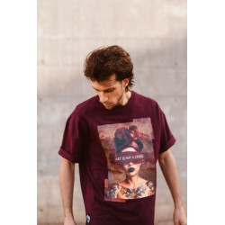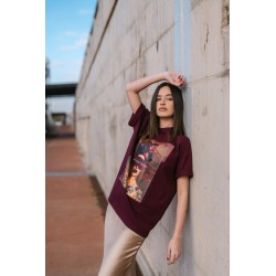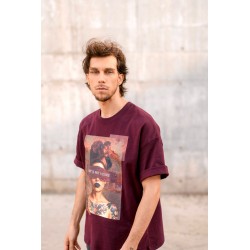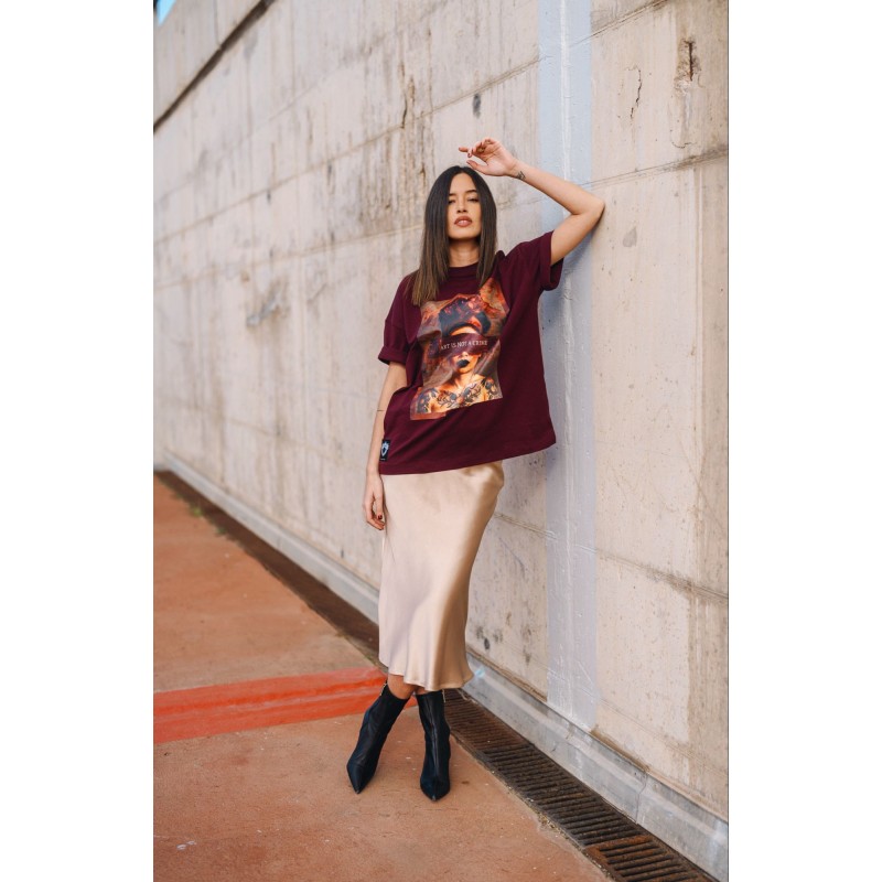 Camiseta Unisex Art Is Not A Crime de la marca Be Happiness. Camiseta unisex con nuevo patrón oversize, en color burgundy y con una ilustración con carácter que ha quedado espesctacular. Una camiseta ideal tanto para él como para ella elaborada en tejido suave al tacto y con durabilidad.