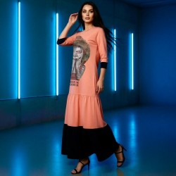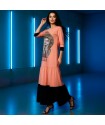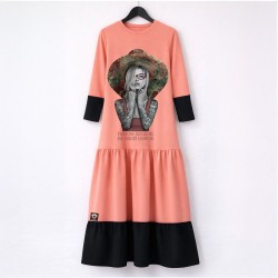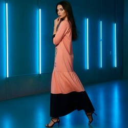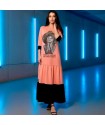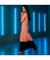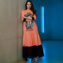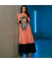 <p>Vestido Bloom de la marca Be Happiness. Vestido en color coral combinado con negro en bajo y puños, con cuello redondo y manga 3/4. Patrón con corte a la altura de la cadera dando a la parte baja volumen para crear una figura más favorecedora y estilizada. Ilustración frontal en la que resaltan sobre el gris las gafas del sol con montura en rojo y los tatuajes de los brazos así como el sombrero.</p>