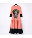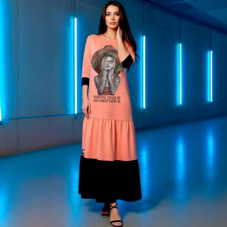 Vestido Bloom de la marca Be Happiness. Vestido en color coral combinado con negro en bajo y puños, con cuello redondo y manga 3/4. Patrón con corte a la altura de la cadera dando a la parte baja volumen para crear una figura más favorecedora y estilizada. Ilustración frontal en la que resaltan sobre el gris las gafas del sol con montura en rojo y los tatuajes de los brazos así como el sombrero.