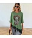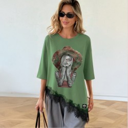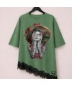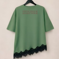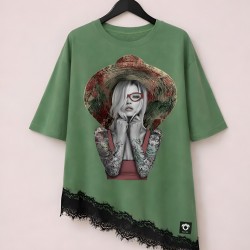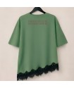 Camiseta Combinada Bloom de la marca Be Happiness. Camiseta en tono verde kashmir con bajo asimétrico y encaje negro. De corte oversize y manga caída corta. Ilustración delantera a todo detalle y frase en la espalda con carácter.