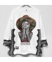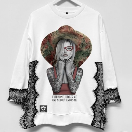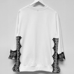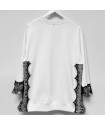 Sudadera Bloom de la marca Be Happiness. Sudadera en blanco combinado con encaje en negro en laterales y puños aportando a la prenda un toque delicado y elegante. Cuello redondo, manga larga y aberturas laterales. De corte oversize. Ilustración delantera del estilo que identifica cláramente a la marca sobre una frase con mucha actitud.