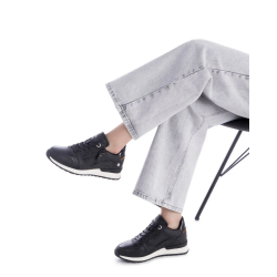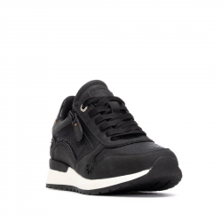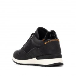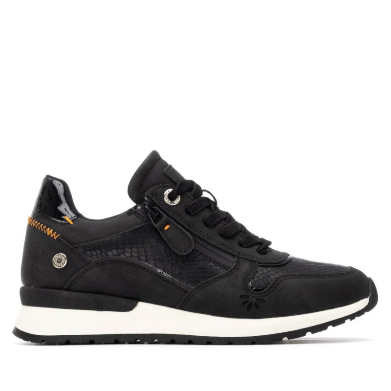 Deportivo Negro Combinado de la marca Refresh. Zapatilla en color negro de suave material que imita la piel combinada con detalle lateral en estampado tipo serpiente. Cierre de cremallera lateral y con cordones para ajuste a cada pie. Suela de goma en color blanco a contraste y bajo en negro antideslizante.