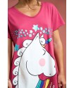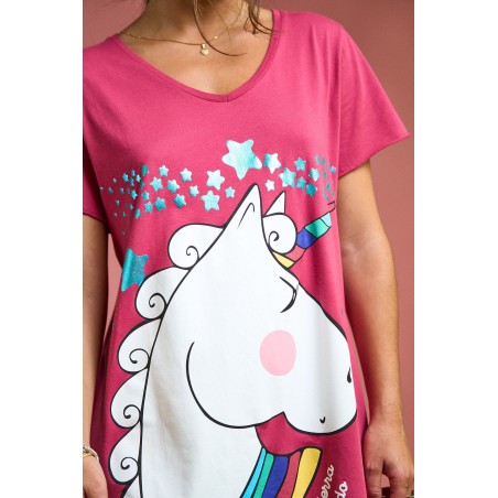 Vestido Niña Unicornio de Anabel Lee. Vestido corto, tipo tunica, de manga corta y escote pico. Base en color frambuesa y maxi print frontal del mitico unicornio de Anabel lee.
