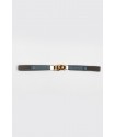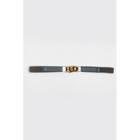 Nolan Belt Minueto. Cinturón elástico estrecho, en color azul, realizado con goma elástica y frontal con material imitación a cuero en color azul. Cierre con gancho decorativo en el frontal en dorado. Se ata por la parte de atrás con corchete.