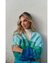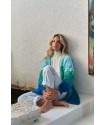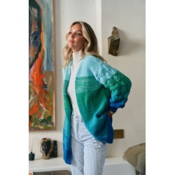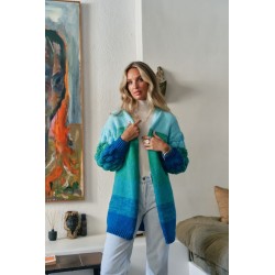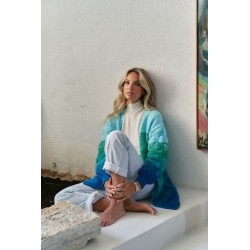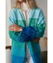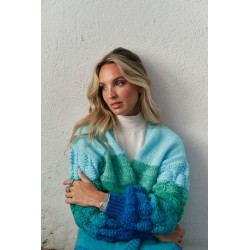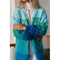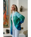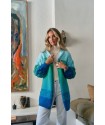 Cardigan Navy Serenityde la marca Jaase. Chaqueta de punto abierta y recta de corte oversize realizada en varios colores de la gama azul y verde simulando un degradado. Con detalle especial en las mangas con punto con dibujo que resalta sobre el punto liso del cuerpo.
